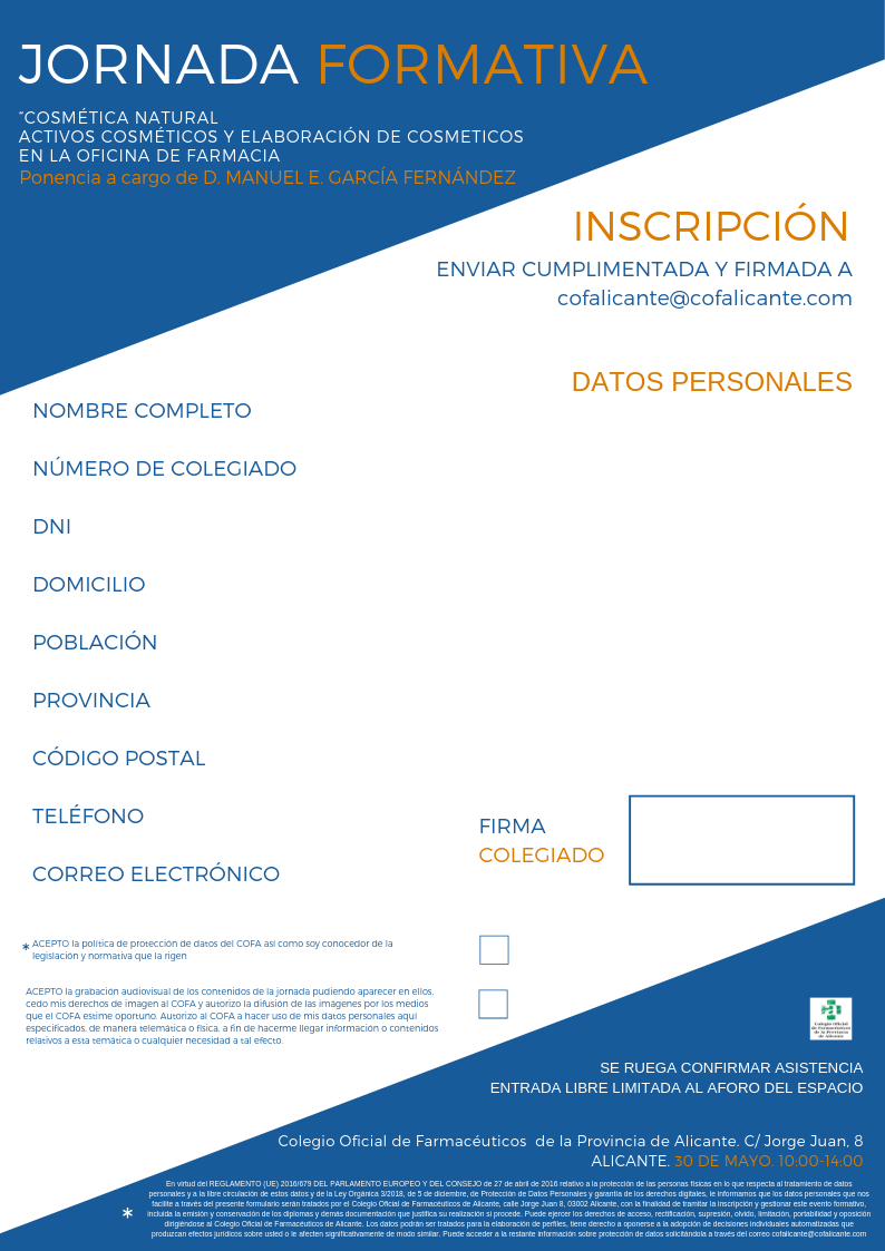 A fin de agilizar el proceso de entrada a las instalaciones del COFA y dado el gran número de asistentes que se esperan para esta Sesión, se ruega rellenen la hoja de inscripción y la manden firmada a cofalicante@cofalicante.com