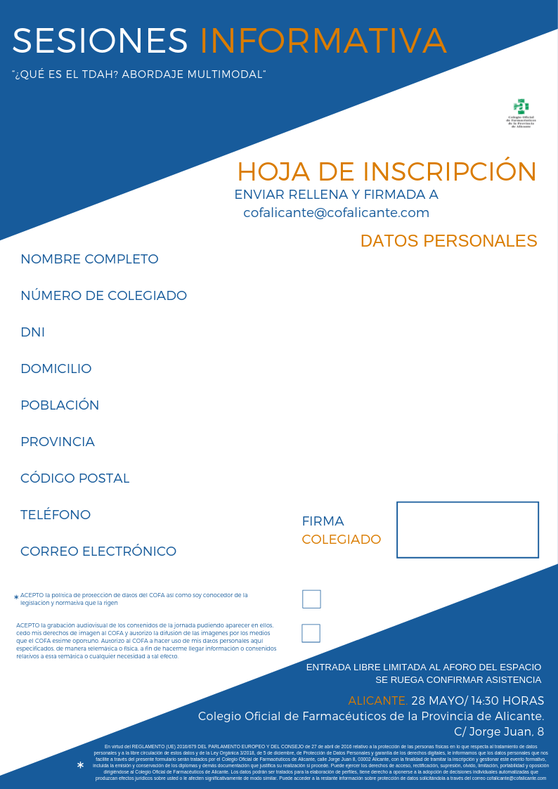 A fin de agilizar el proceso de entrada a las instalaciones del COFA y dado el gran número de asistentes que se esperan para esta Sesión, se ruega rellenen la hoja de inscripción y la manden firmada a cofalicante@cofalicante.com